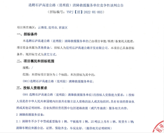 选聘石泸高速公路(昆明段)清障救援服务单位竞争性谈判公告