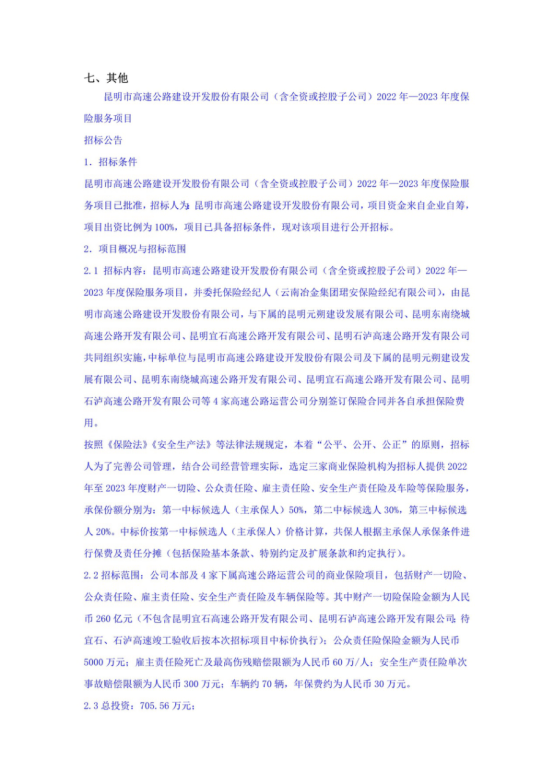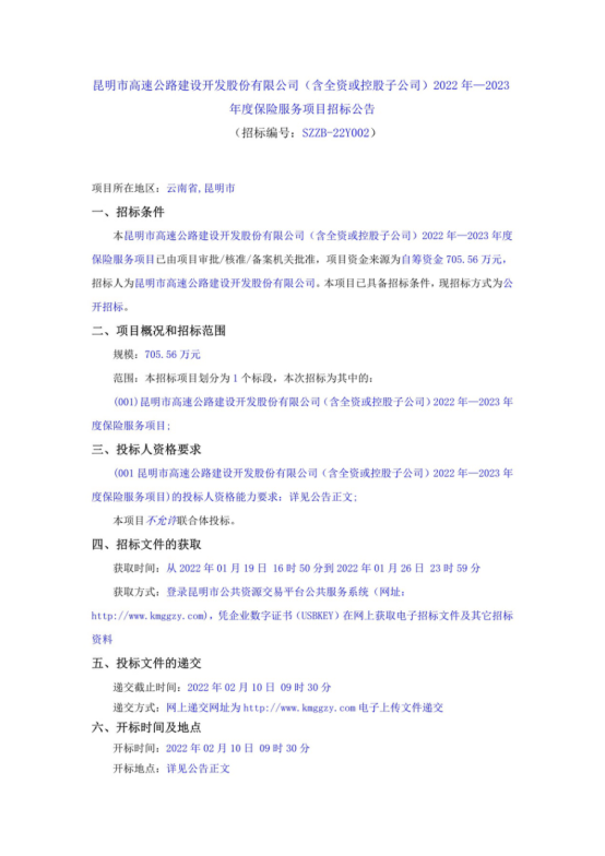 昆明市高速公路建设开发股份有限公司(含全资或控股子公司)2022年—2023年度保险服务项目招标公告