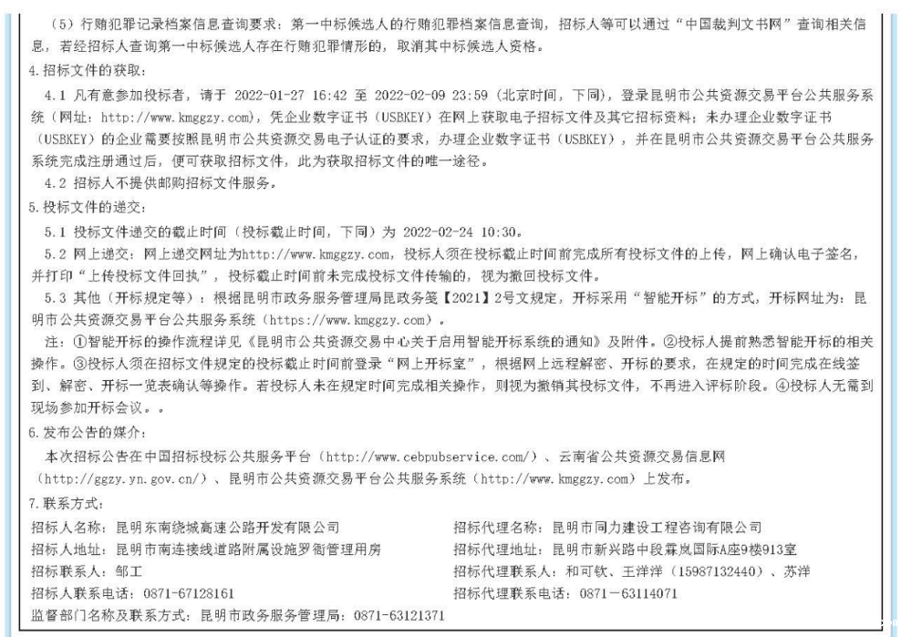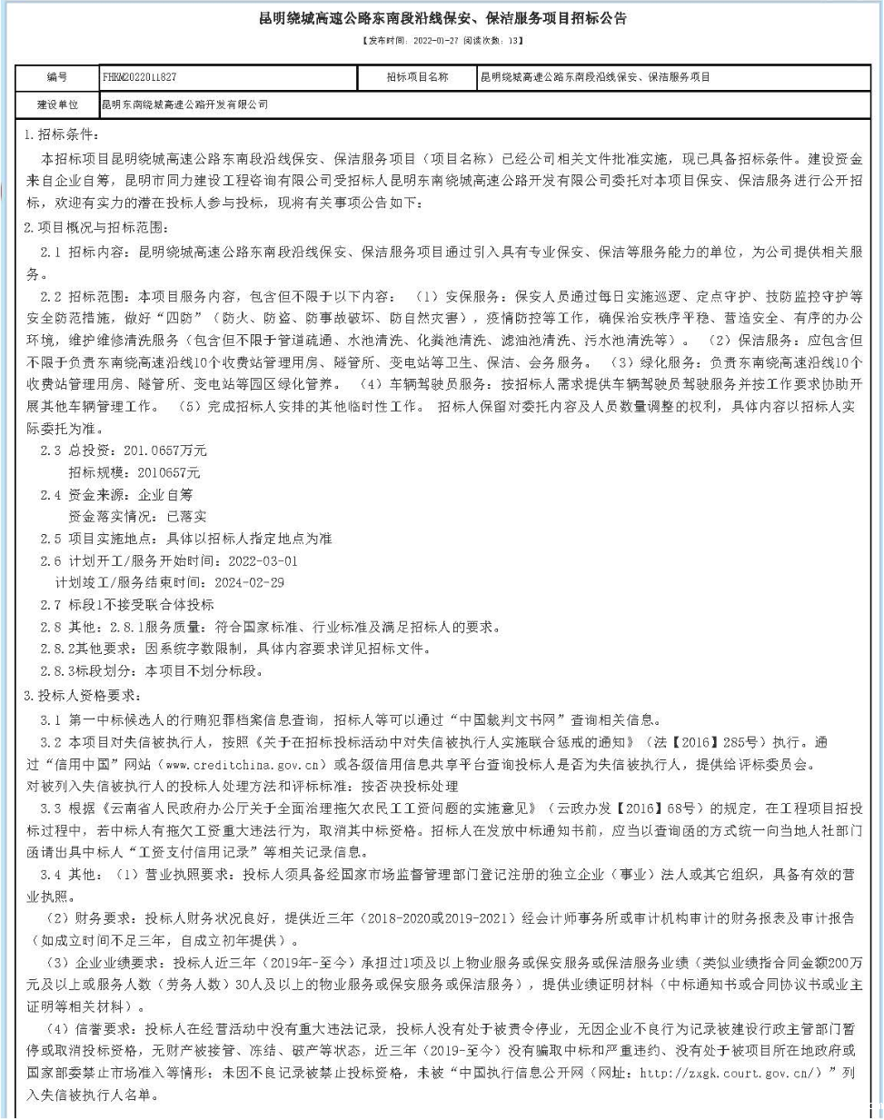 昆明绕城高速公路东南段沿线保安、保洁服务项目招标公告