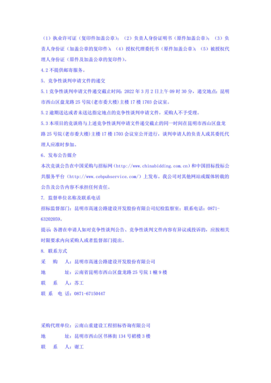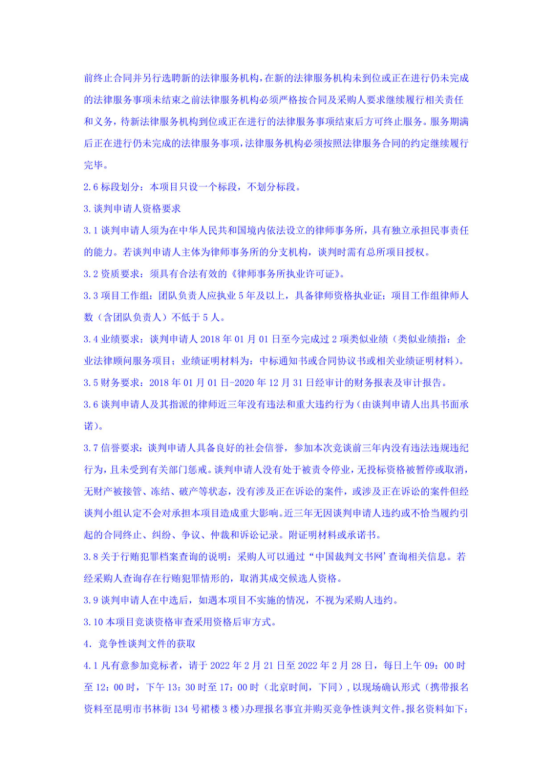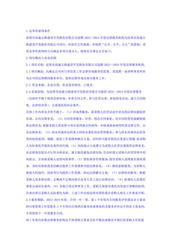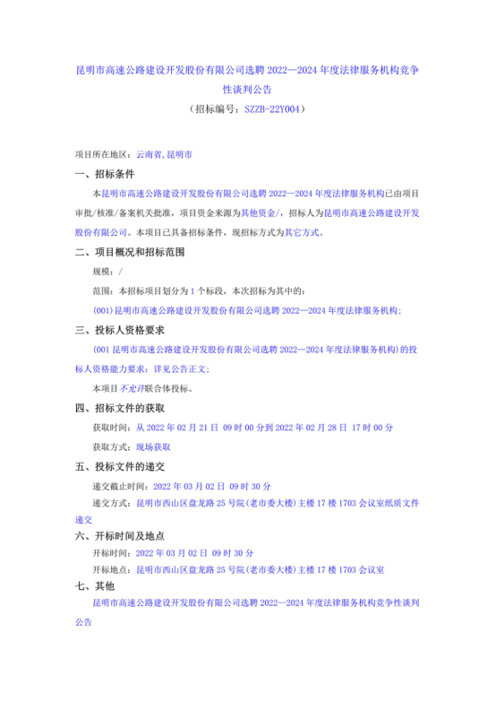 昆明市高速公路建设开发股份有限公司选聘2022—2024年度法律服务机构竞争性谈判公告