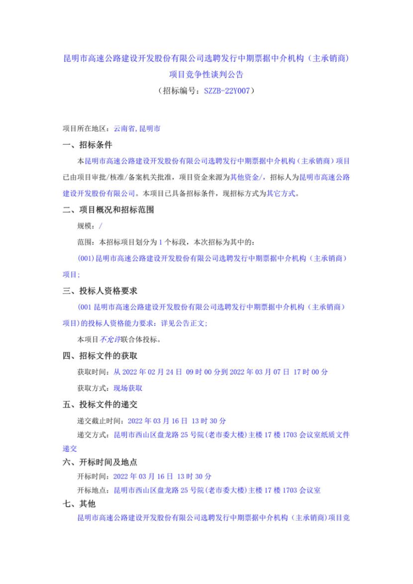 昆明市高速公路建设开发股份有限公司选聘发行中期票据中介机构(主承销商)项目竞争性谈判公告