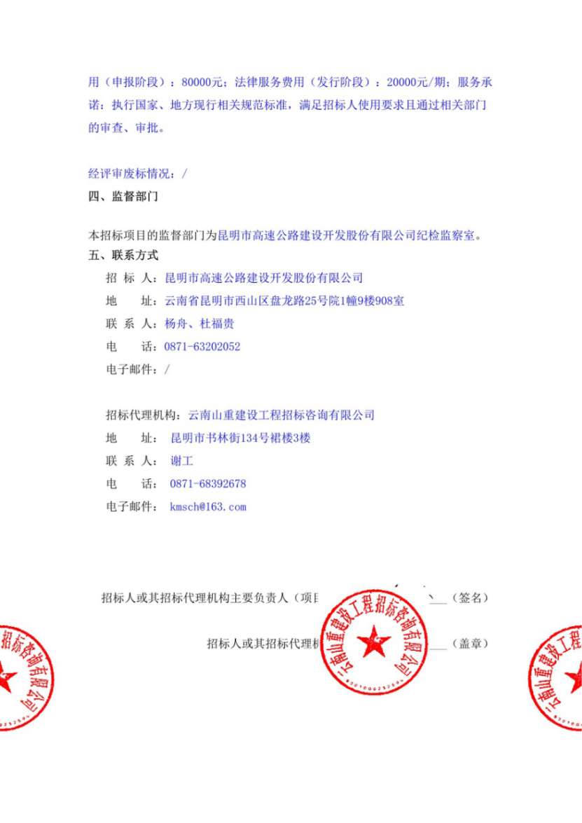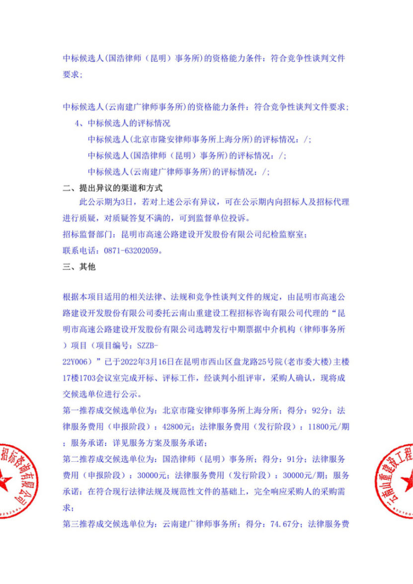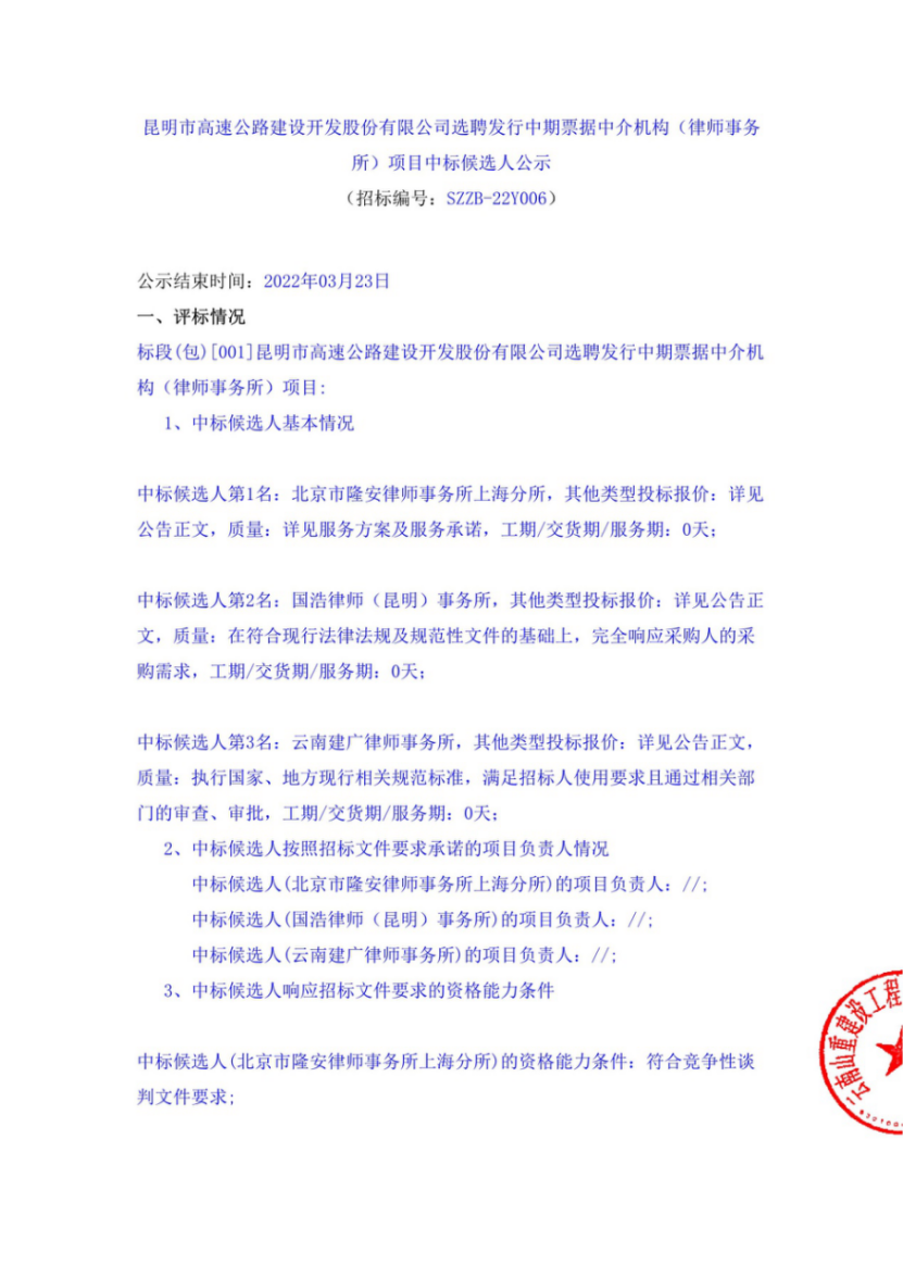 昆明市高速公路建设开发股份有限公司选聘发行中期票据中介机构(律师事务所)项目中标候选人公示(2022年)