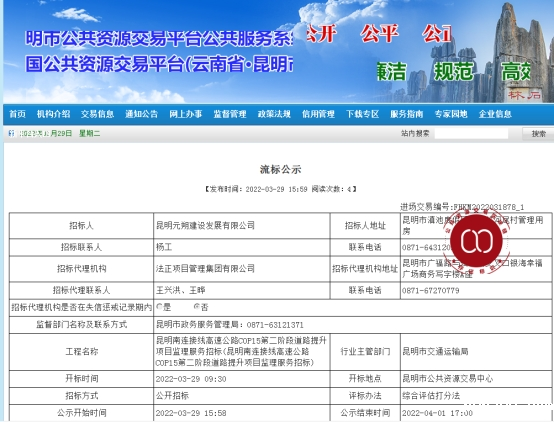 昆明南连接线高速公路COP15第二阶段道路提升项目监理服务招标项目流标公示