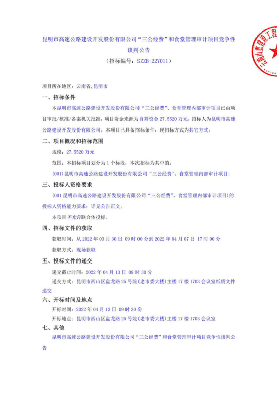 昆明市高速公路建设开发股份有限公司“三公经费”、食堂管理内部审计项目竞争性谈判公告