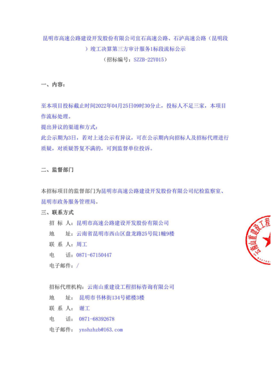 昆明市高速公路建设开发股份有限公司宜石高速公路、石泸高速公路(昆明段)竣工决算第三方审计服务1标段流标公示