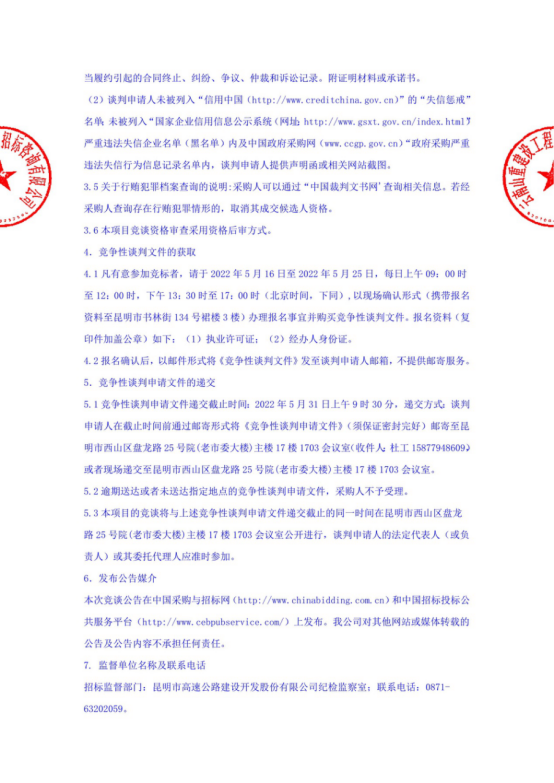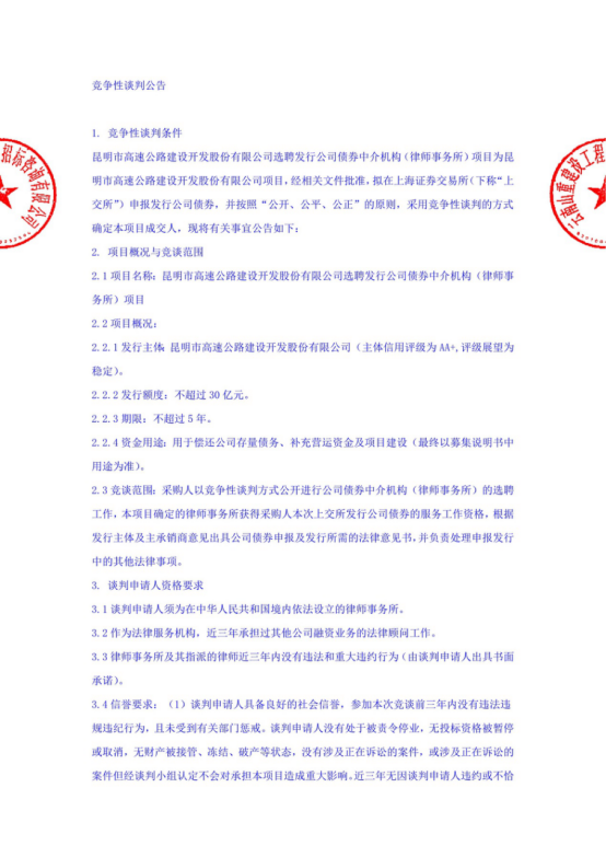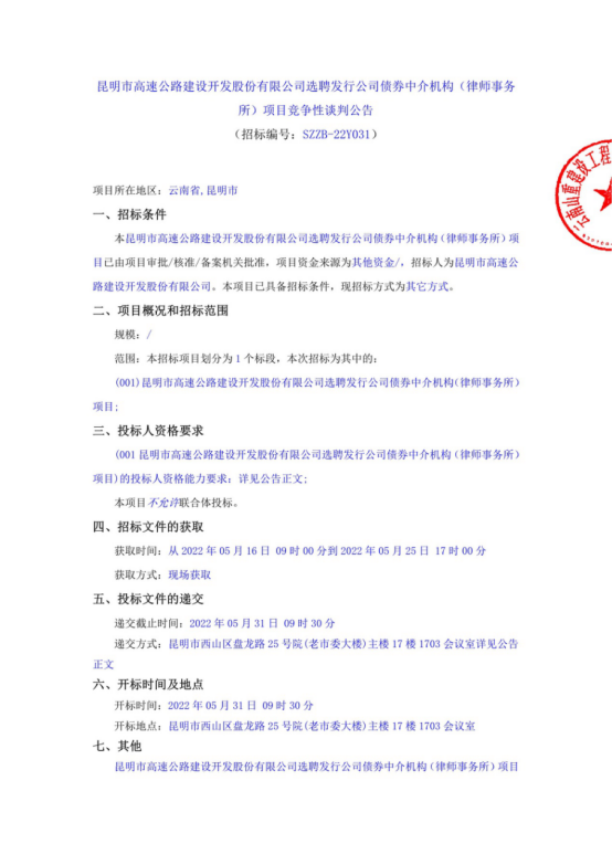 昆明市高速公路建设开发股份有限公司选聘发行公司债券中介机构(律师事务所)项目竞争性谈判公告(2022年5月)