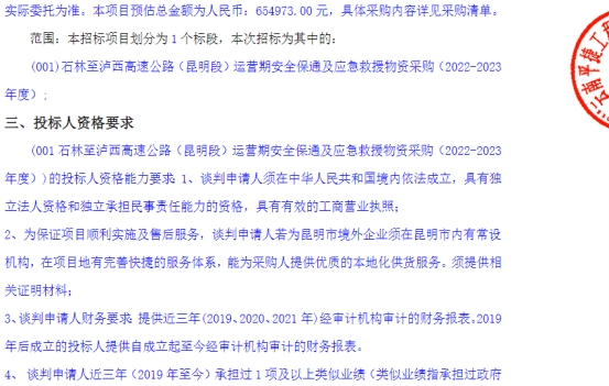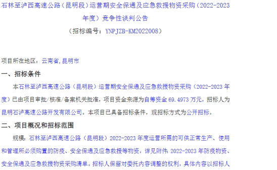 石林至泸西高速公路(昆明段)运营期安全保通及应急救援物资采购(2022-2023年度)竞争性谈判公告
