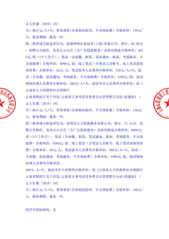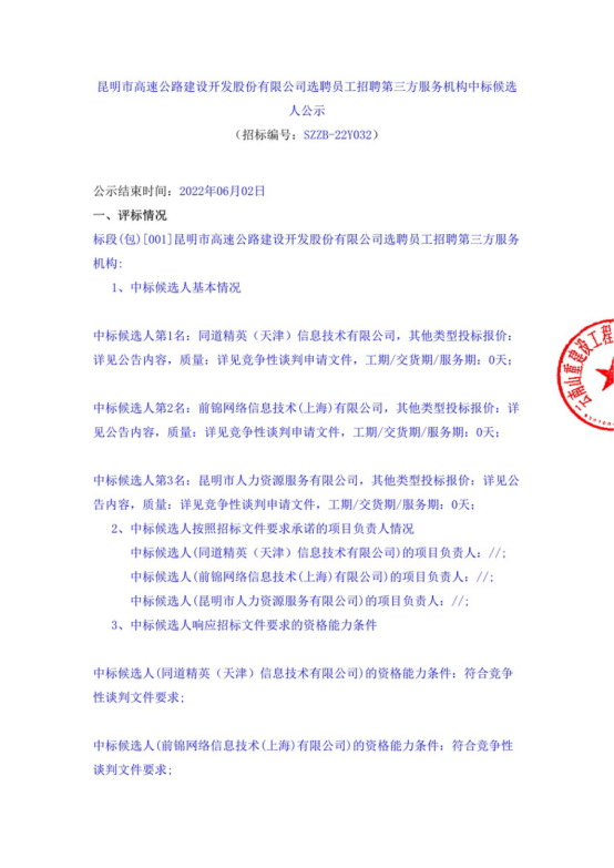 昆明市高速公路建设开发股份有限公司选聘员工招聘第三方服务机构中标候选人公示