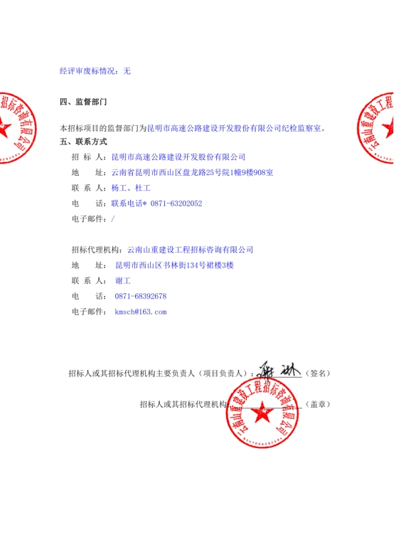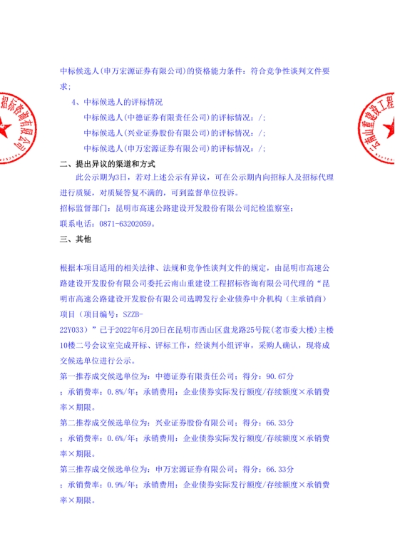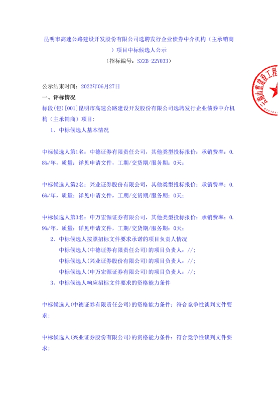 昆明市高速公路建设开发股份有限公司选聘发行企业债券中介机构(主承销商)项目中标候选人公示