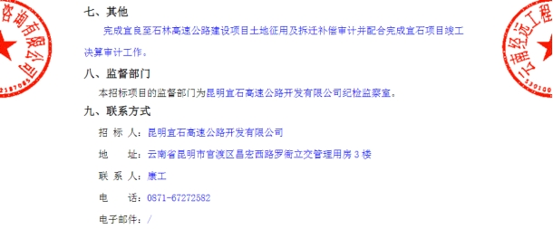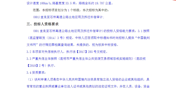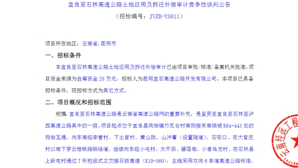 宜良至石林高速公路土地征用及拆迁补偿审计竞争性谈判公告