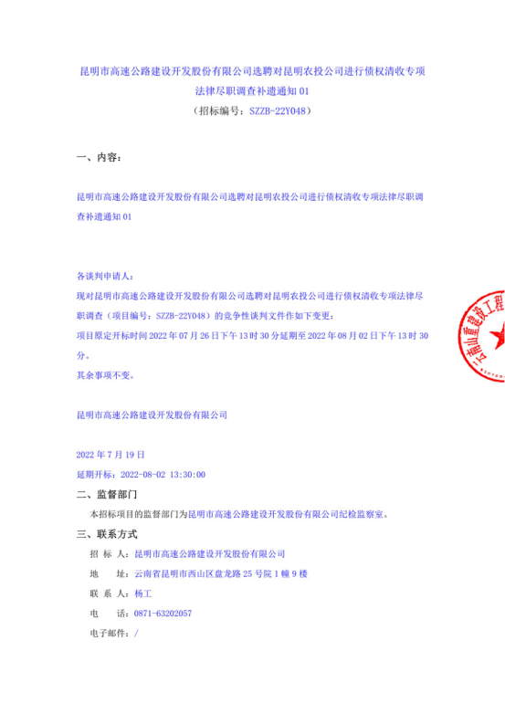 昆明市高速公路建设开发股份有限公司选聘对昆明农投公司进行债权清收专项法律尽职调查补遗通知01
