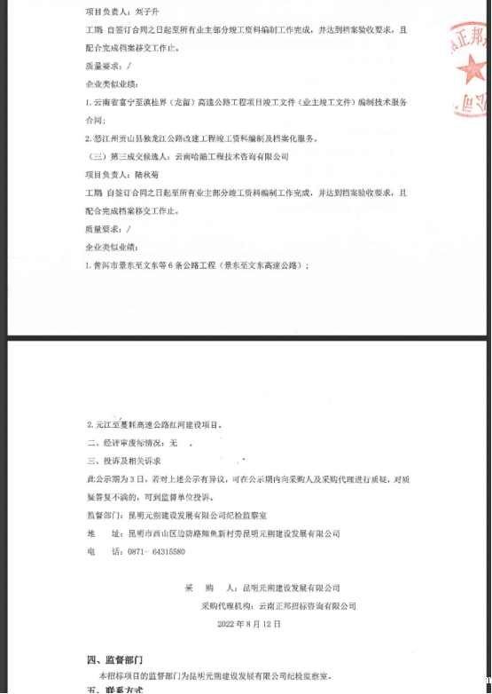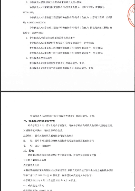昆明南连接线高速公路河尾村立交新增匝道、罗衙立交项目竣工资料业主部分编制服务项目评标结果公示