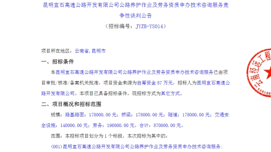 昆明宜石高速公路开发有限公司公路养护作业及劳务资质申办技术咨询服务竞争性谈判公告