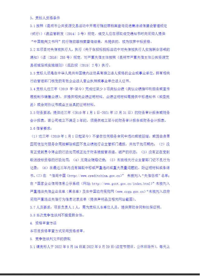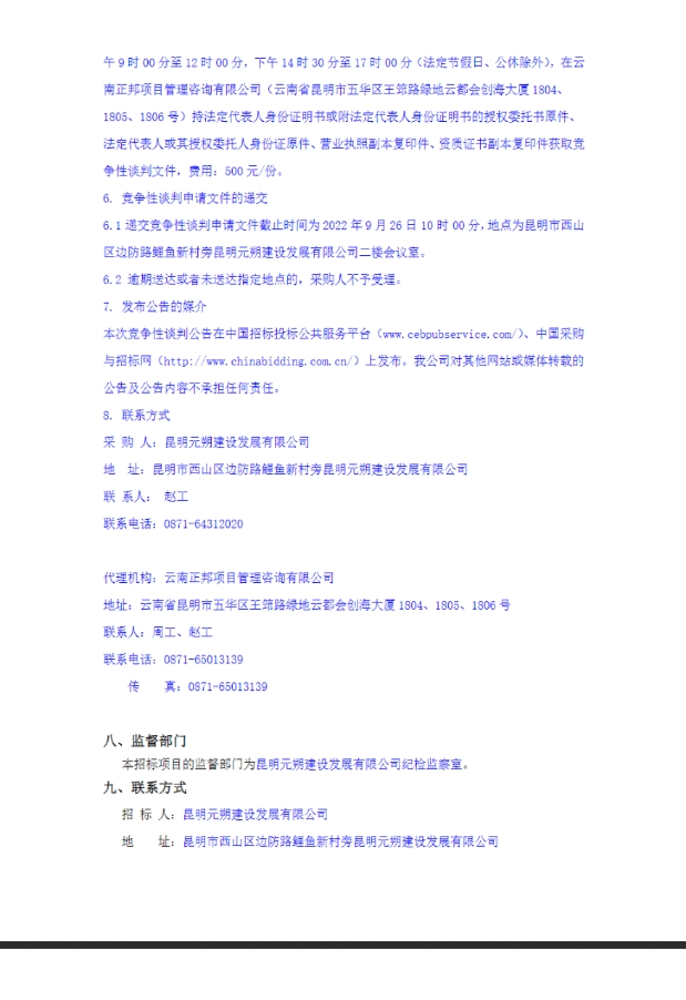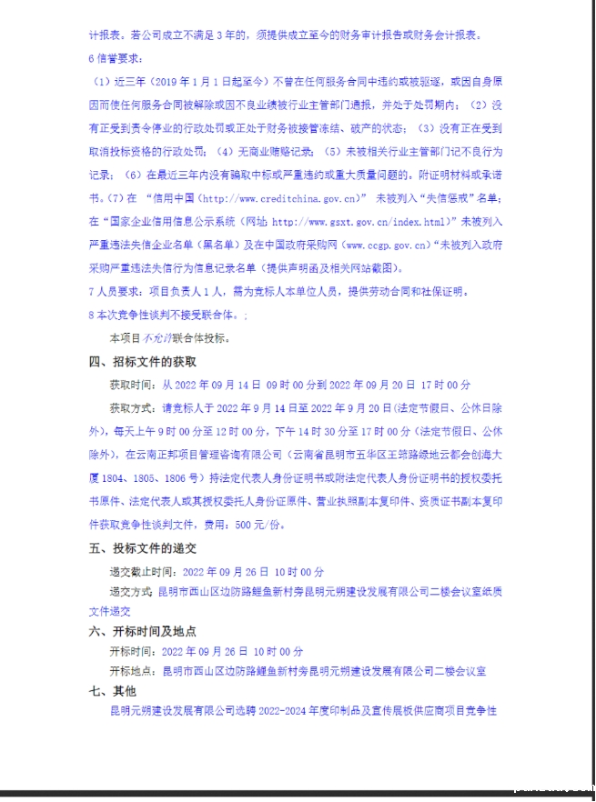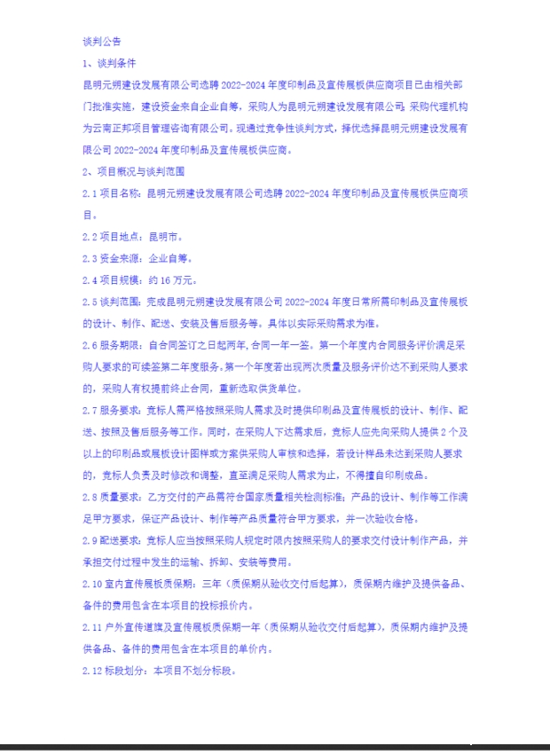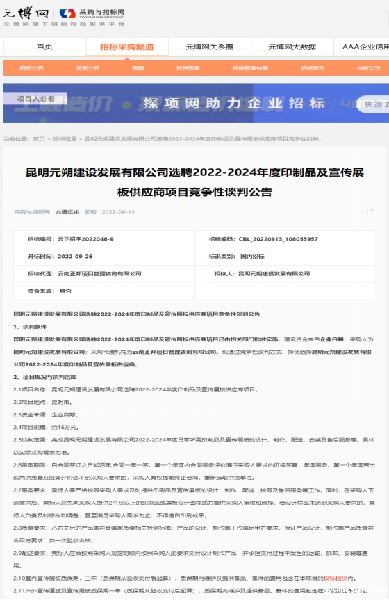 昆明元朔建设发展有限公司选聘2022-2024年度印制品及宣传展板供应商项目竞争性谈判公告