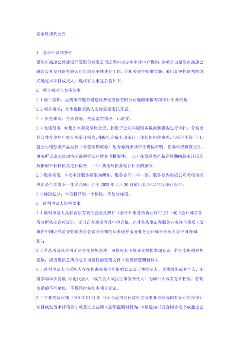 昆明市高速公路建设开发股份有限公司选聘年报专项审计中介机构竞争性谈判公告