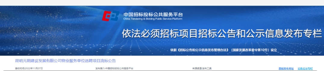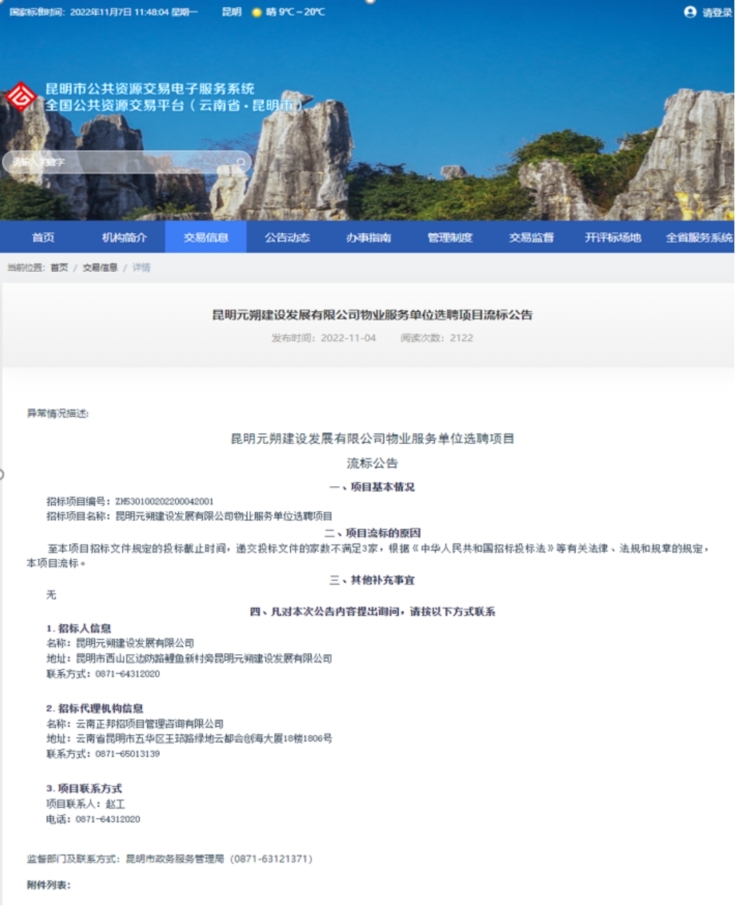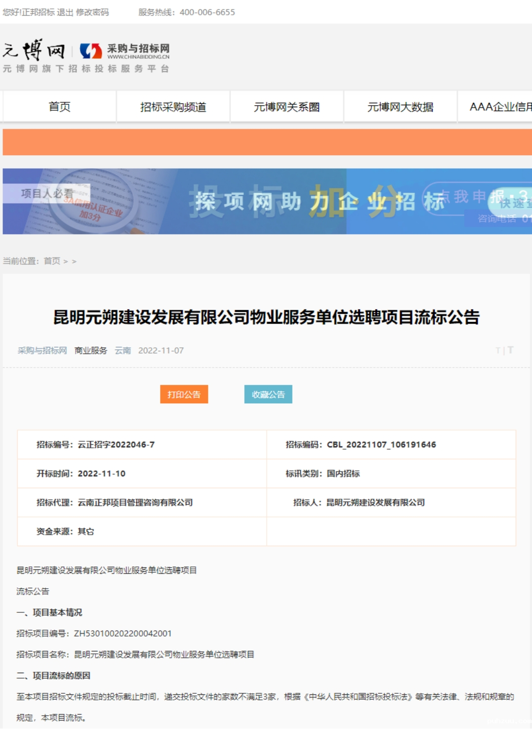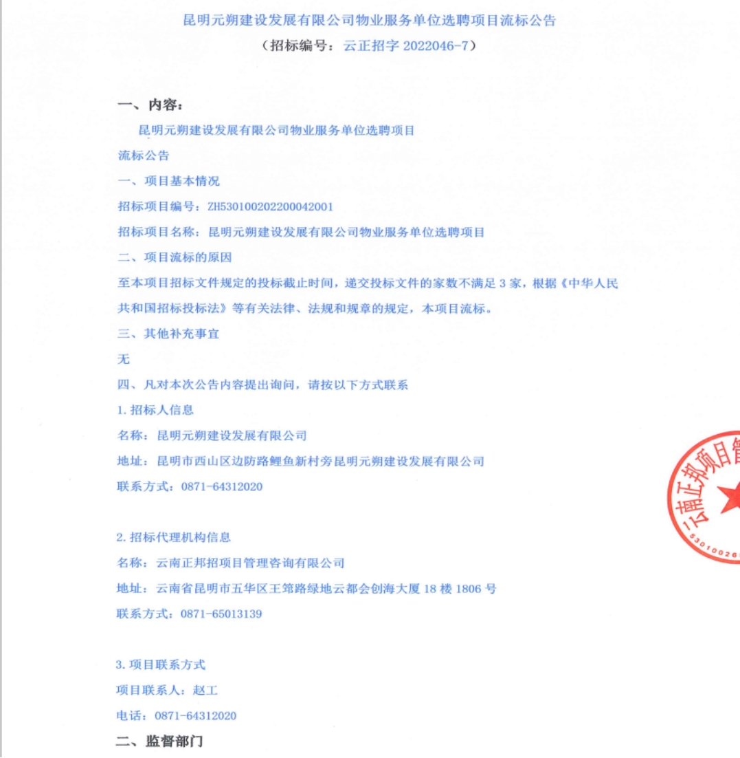 昆明元朔建设发展有限公司物业服务单位选聘项目流标公告